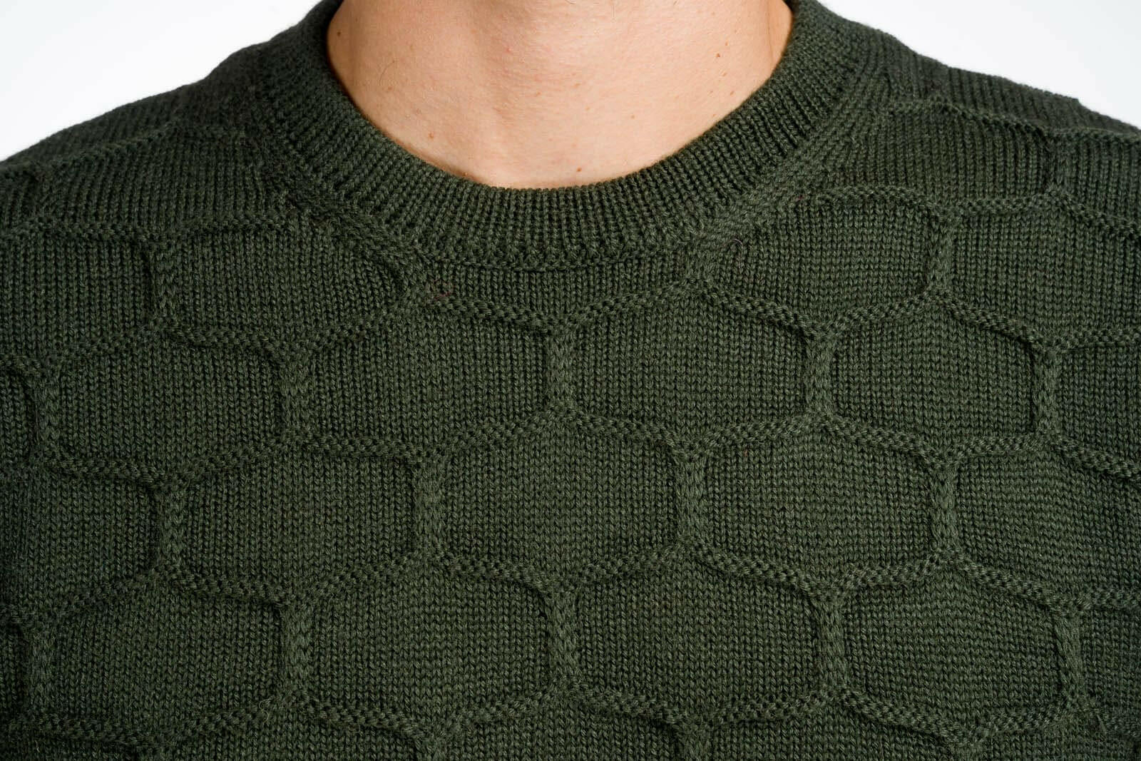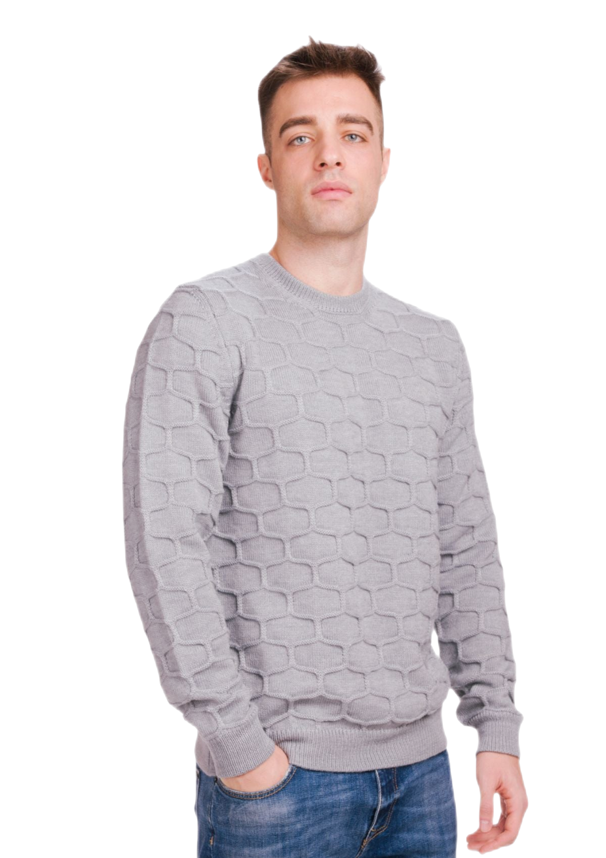 Sporty men's crew neck sweater, with jersey stitch and raised hexagonal patterns in links stitch.