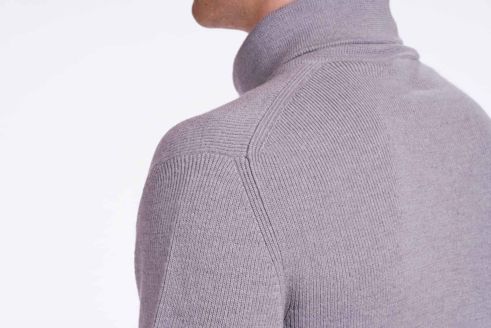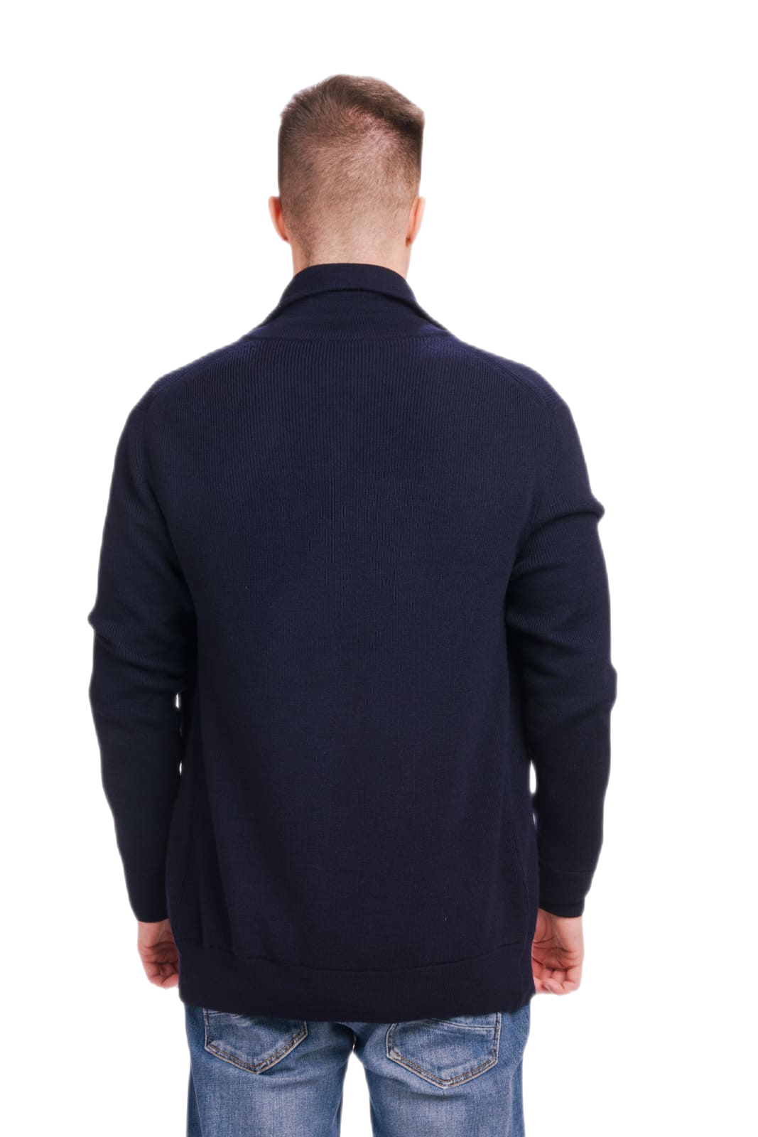 Cardigã masculino gola alta em lã merino, fechado com zíper de cursor duplo. Uma peça de alta artesania, com acabamentos de qualidade.